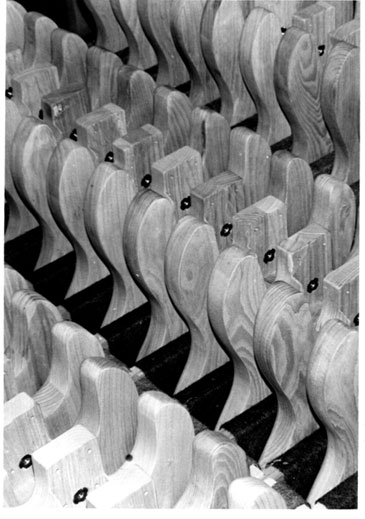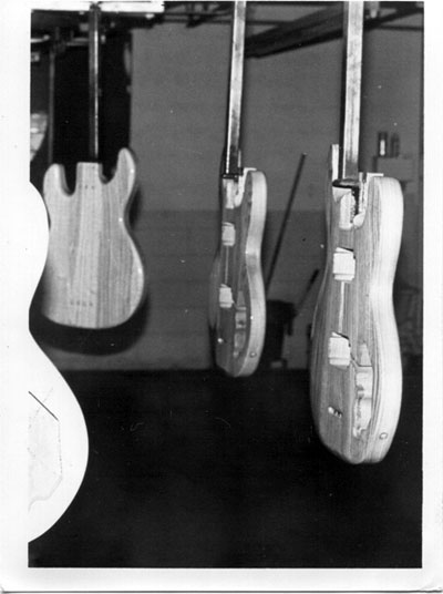 After an unenthusiastic response to using a machine designed to produce captains chairs, Chip convinced Hartley to employ a gun stock carving machine to make necks. These pattern-tracing machines were ingeniously employed to carve out 4 necks simultaneously. Forty horsepower motors ran at 40,000 rpm to create the necks. The master was 1.5 times larger size which made the necks more accurate. It had a sanding device that was the exact size and shape of the cutters. When a neck rolled off the carving machine it was ready to be finished and fretted. No hand sanding was required. This insured a uniformity across all T-60 necks that hadn’t ever been seen in the industry. Note: The body carving machine was a CNC, (or more accurately, computer-controlled machine).