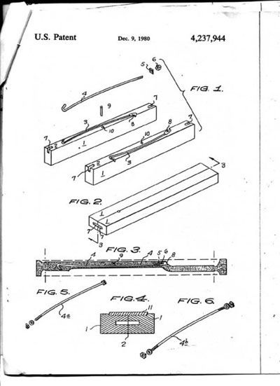 When Chip and Hartley came up with a patented method for manufacturing necks, they settled on the idea of using a torsion rod with a hook on the end, that would grab the wood and keep it from rotating. When the first carved samples came in, they quickly discovered that once the torsion rod was tightened up it pulled the hook right through the wood (or in some cases, straightened the hook out). This photo is of one of the first prototype necks that came out (number 003). To resolve this problem, Chip dug around where the hook was, and filled it with epoxy. That fixed the problem (obviously this wasn’t the production method). Also, the neck tilt mechanism was designed to rest up against a slug. Chip designed the first few “slug slots” to be the same size as a nickel, so that a nickel could be used while they were waiting for the slugs to come in. Hartley quickly decided that it was in the financial best interest of the company to switch to pennies! Some of the very first necks have pennies in them instead of production slugs. If you find one with a coin in it, it was likely a prototype that slipped out of the factory somehow.
