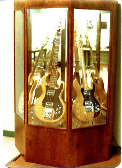 This is a display case which is still somewhere at Peavey. Chip sounded to me like he still has his sites set on it! The case houses the three original guitars made (with mirrors in the back to make it look like 6). The center guitar is a CT-B (bass model). Notice the 3 tuning keys on one side of the bass in the background reflection. The far right side model is the CT-1 (this became the production model). Interesting little fact. Two days before the NAMM trade show in 76’ Peavey still did not have a guitar to display. Chip made these three guitars in two days in his carport at home to display at the show. This case was up in the attic at Peavey the last time Chip was there. The guitars are now on stands in the museum at Peavey, however, the museum is temporarily closed down.
